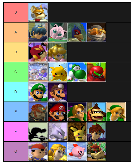 Statistics for the character placements and separations are available with individual votes from the top players to be posted individually over time. The first tier list made public on october 8 2002 is evidence of how dramatically the metagame has shifted since those days. In later tier lists characters are broadly ranked by their tier and further ranked by the order in which characters are listed within the tier list. For instance falco is ranked above samus in the fourth melee tier list. Earlier tier lists use numerical rankings and. Ultimate this is the latest and most widely accepted smash tier list for super smash bros.