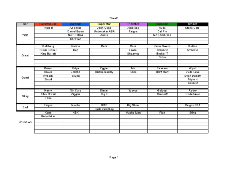 Acrobat brought to you by jleger201truking and all of wwexecutionthis spreadsheet applies to 3 superstars the information may not work on superstars under 3 superstarbest trainers in ordertrainer bonusbreakpointbest tag teamsspeed ranktier ranking aj styles the phenomenal onebpp is. Wwe theme songs all time wwe women. Wrestling tier list templates. I dont have high hopes for this but i was looking for any relatively updated tier list that was available. It will be updated when new. Wwe champions tier list by punisher.